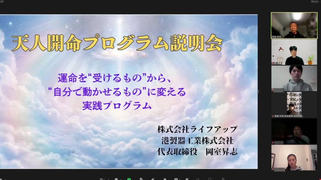 人生を拓く覚悟がある経営者へ(個人事業主、及びその候補者も可)運命を開くシステムを行動原理として身につける天人開命プログラムのオンライン説明会を開催しましたのでその録画動画を以下登録いただければ閲覧いただけます。